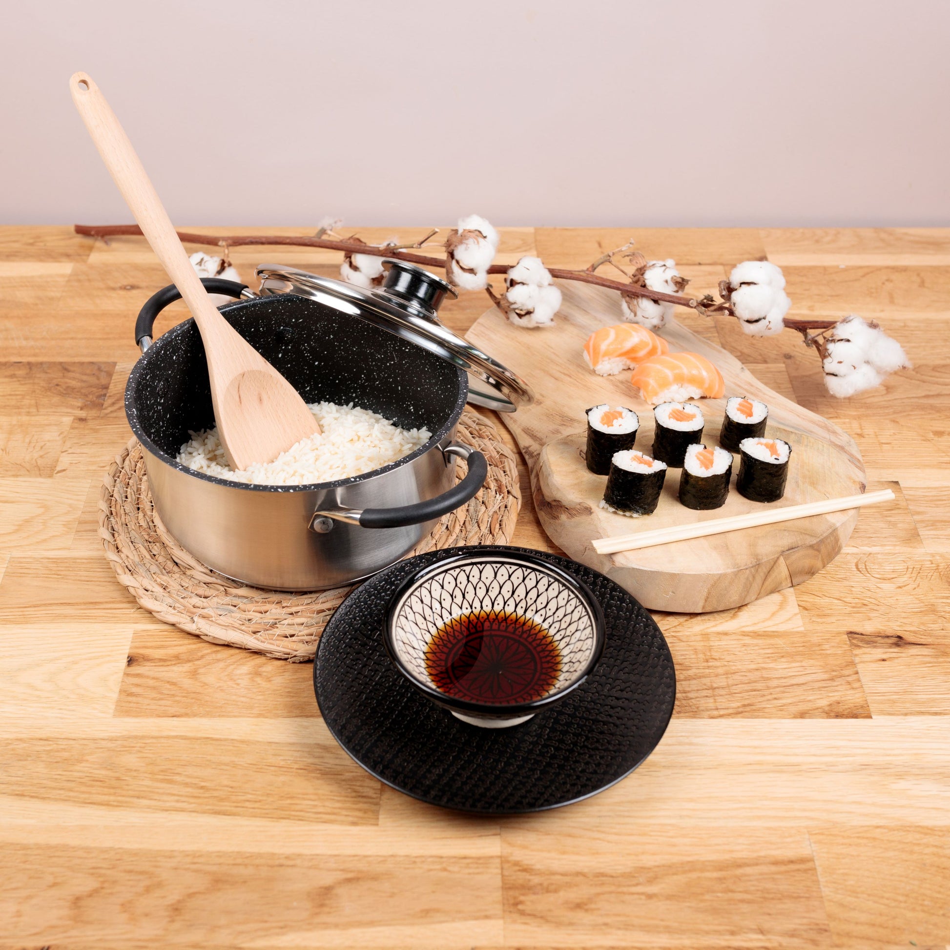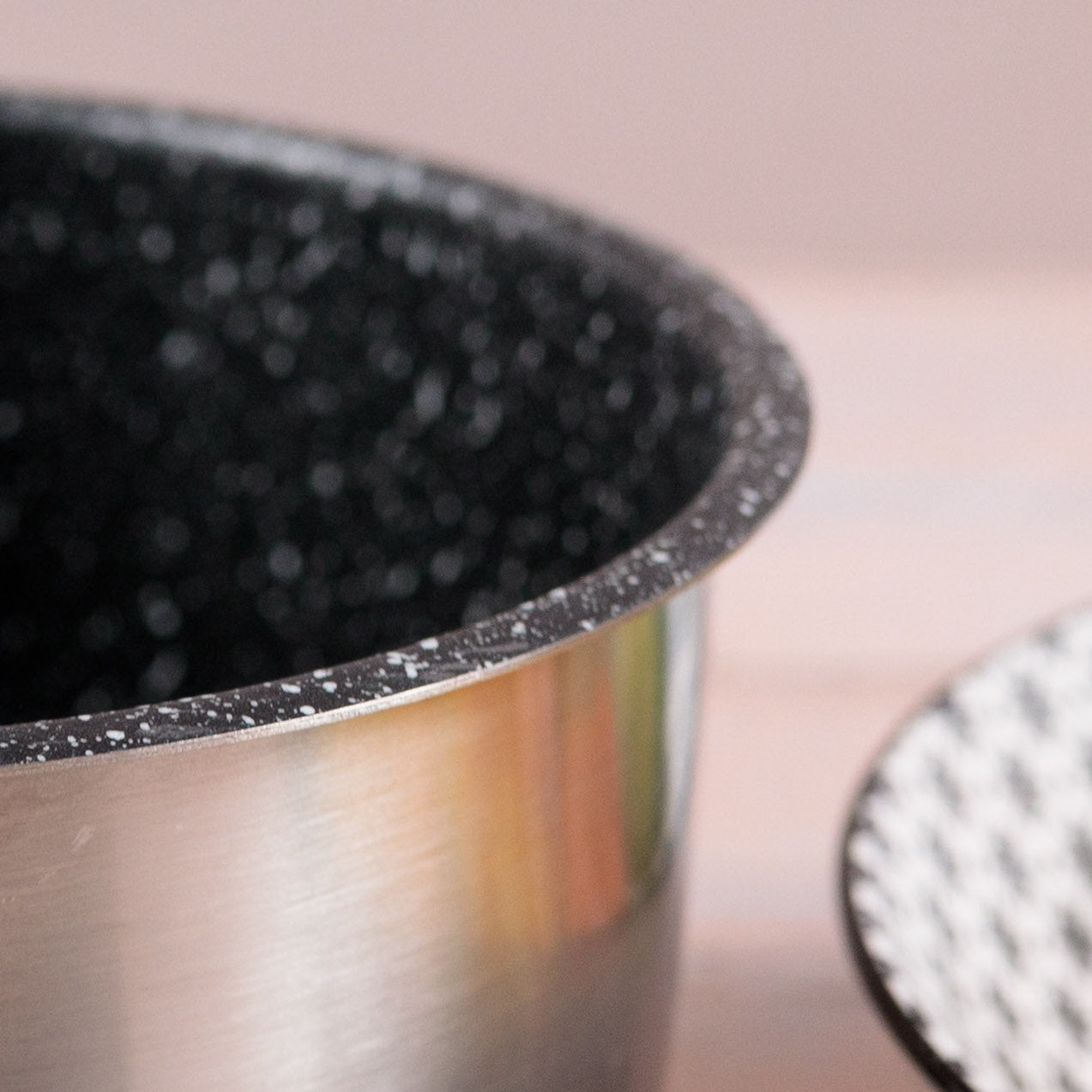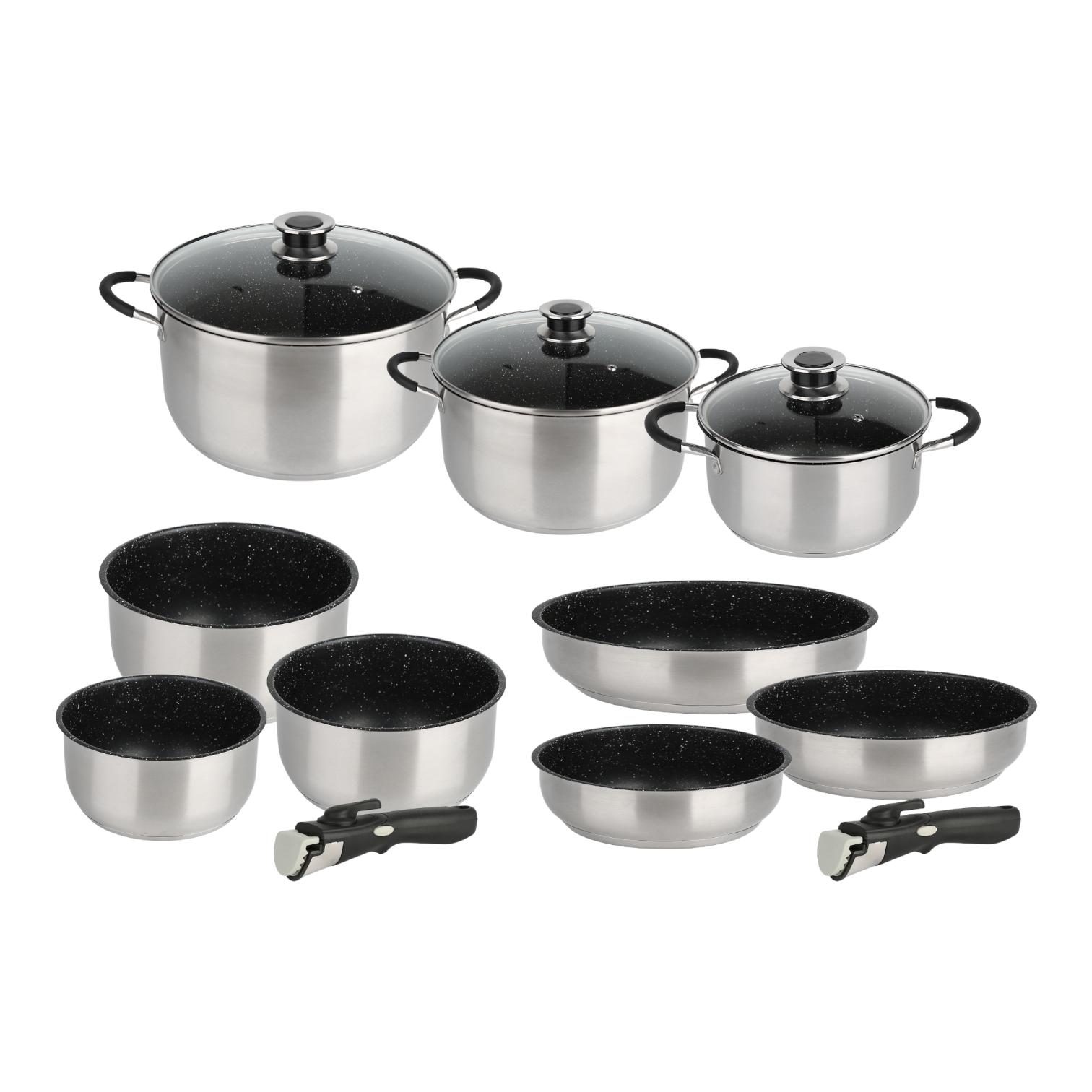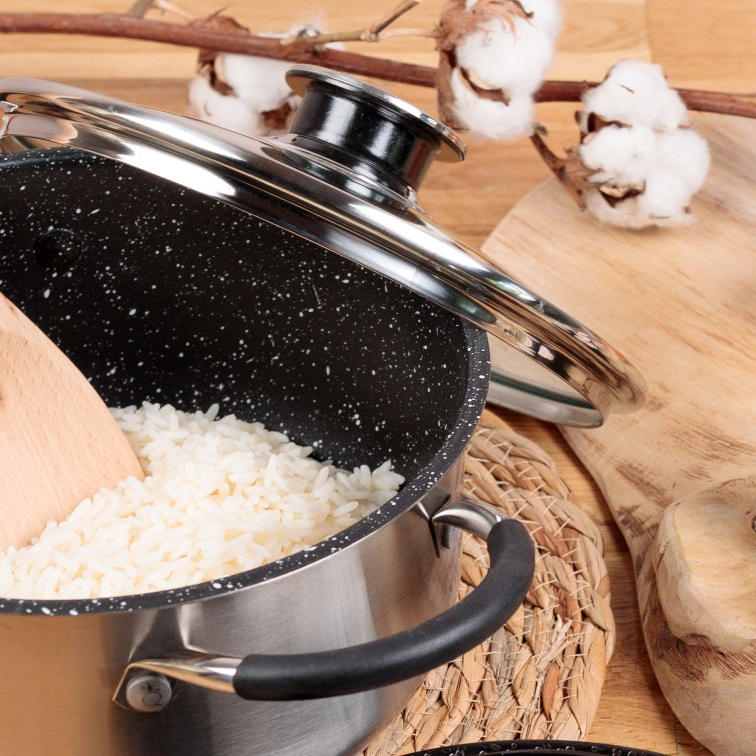 This KAMBERG® 12-piece brushed steel battery is equipped with a high-performance stone-style non-stick interior coating which allows you to maintain the authenticity of the taste of food, without adding fat. The Kamberg collection is certified for all types of fire and allows uniform heat distribution, contributing to healthy and rapid cooking of your food.
