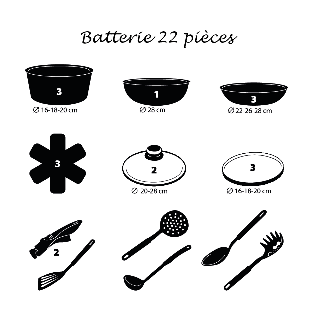 • 3 frying pans (20 cm - 24 cm - 28 cm)