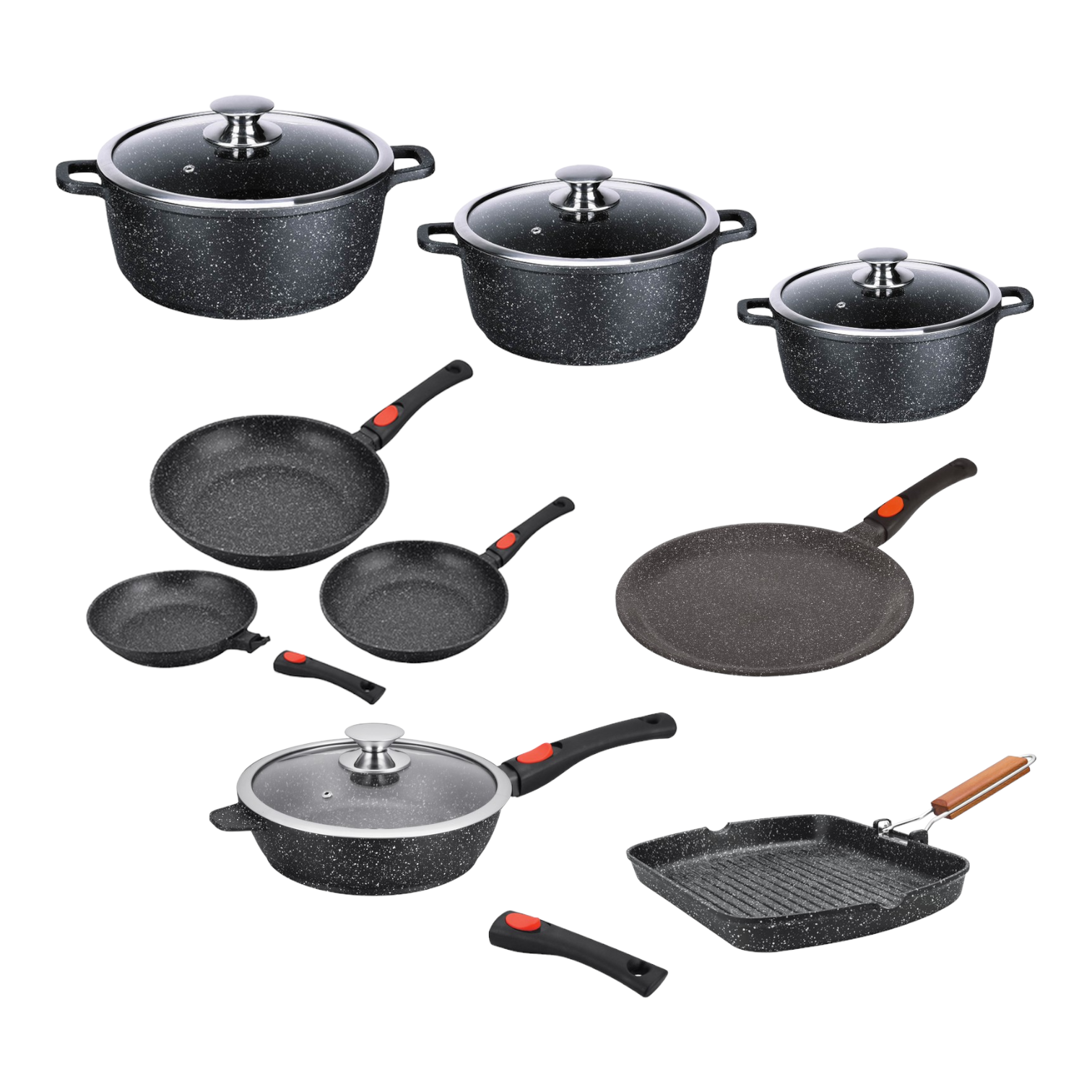 - Equipped with 5 removable handles and 3 pairs of silicone handles