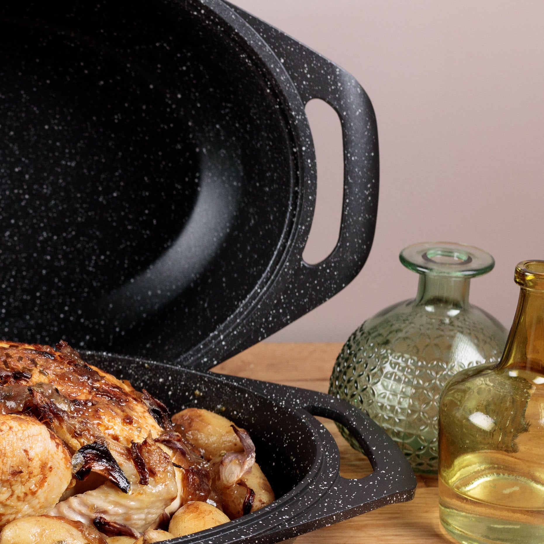 This KAMBERG® 3-piece cast aluminum casserole dish has a high-performance stone-style non-stick coating which allows you to preserve the authenticity of the taste of the food, without adding fat. Cast aluminum guarantees you long-lasting resistance and non-deformability.