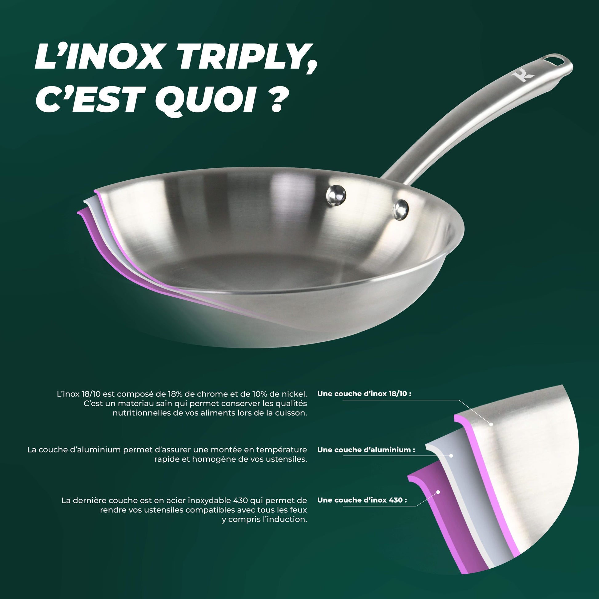 - Inox triply (une couche d'inox 304 (inox 18/10), une couche d'aluminium et une couche d'inox 430).