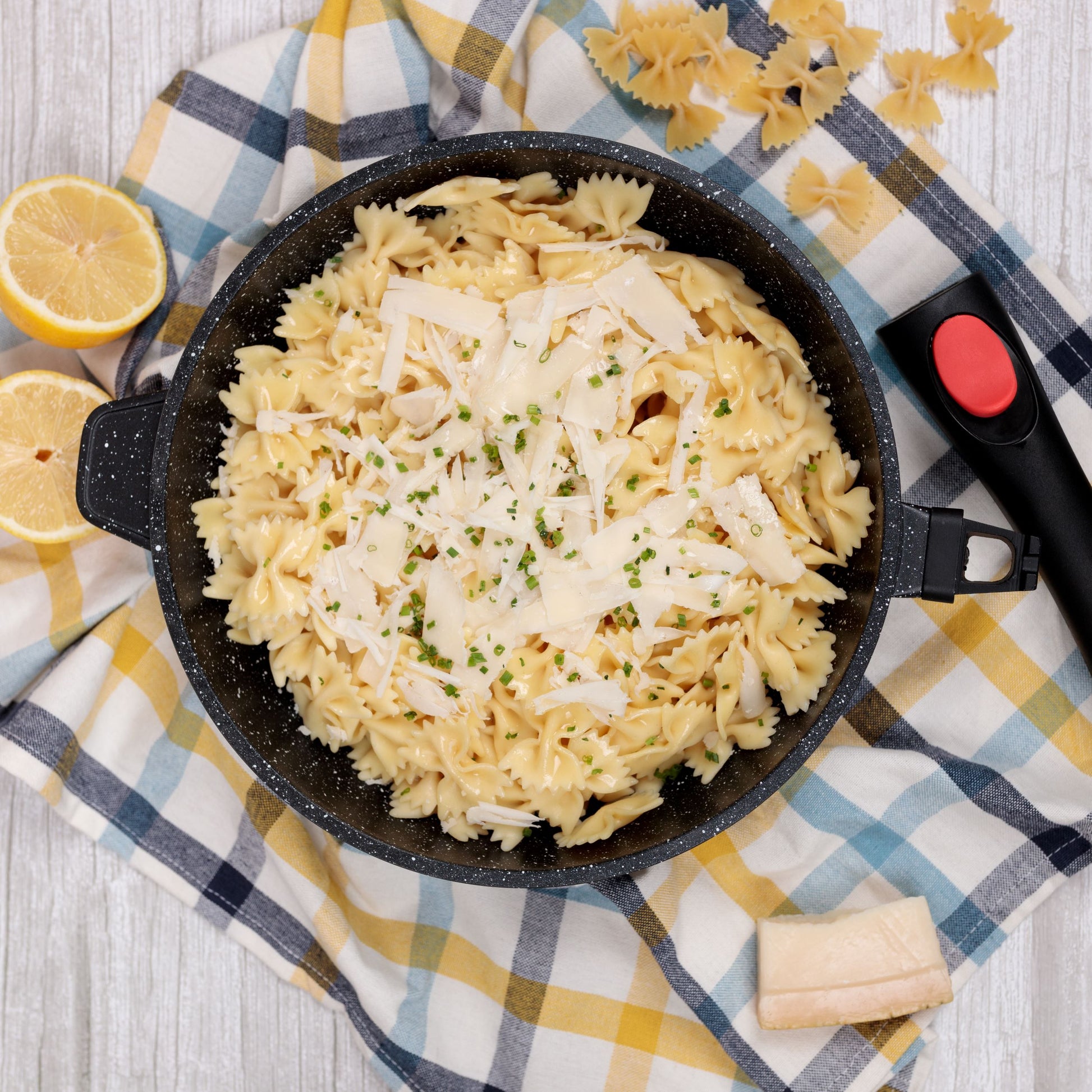 Equipped with a removable handle, this frying pan is easy to store and clean by hand or in the dishwasher.